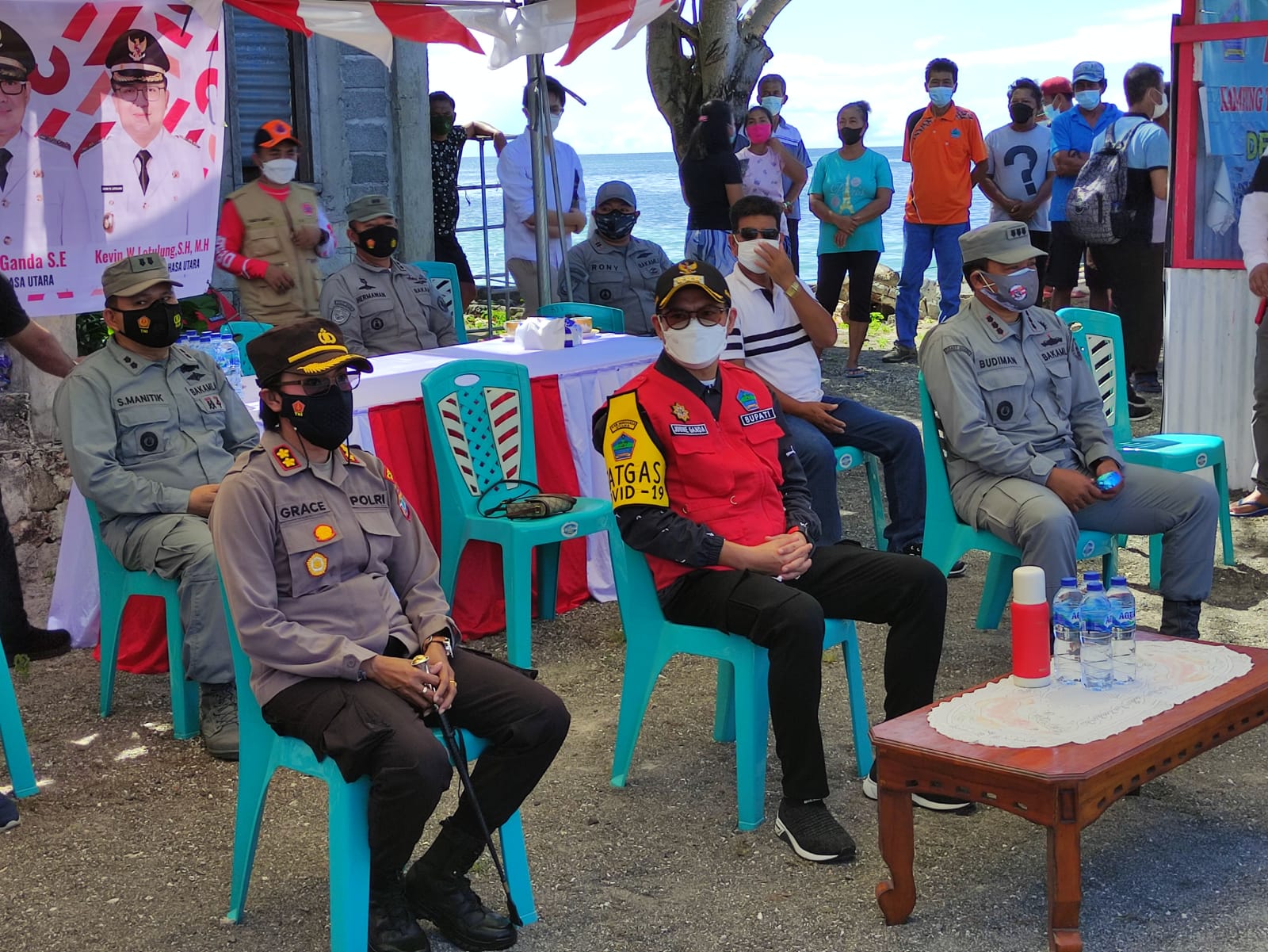 TNews, Minut – Prihatin dengan kondisi masyarakat yang terdampak Pandemi Covid-19, sekaligus melakukan pendekatan dengan warga di wilayah kepulauan, Bupati Minahasa Utara (Minut) Joune J E Ganda, SE didampingi Forum Komunikasi Pimpinan Daerah (Forkopimda) Minut diantaranya Kajari Airmadidi Fanny Widyastuti, Kapolres Minut AKBP Grace Rahakbau dan Badan Keamanan Laut Republik Indonesia (Bakamla RI) Zona Maritim Tengah Kepala Pangkalan Bakamla Dermaga Serei Kolonel Asep Budiman. Kamis (12/08/2021) melakukan kunjungan di wilayah kepulauan Kinabuhutan, Gangga, Bangka dan Talise (KIGABATA).
