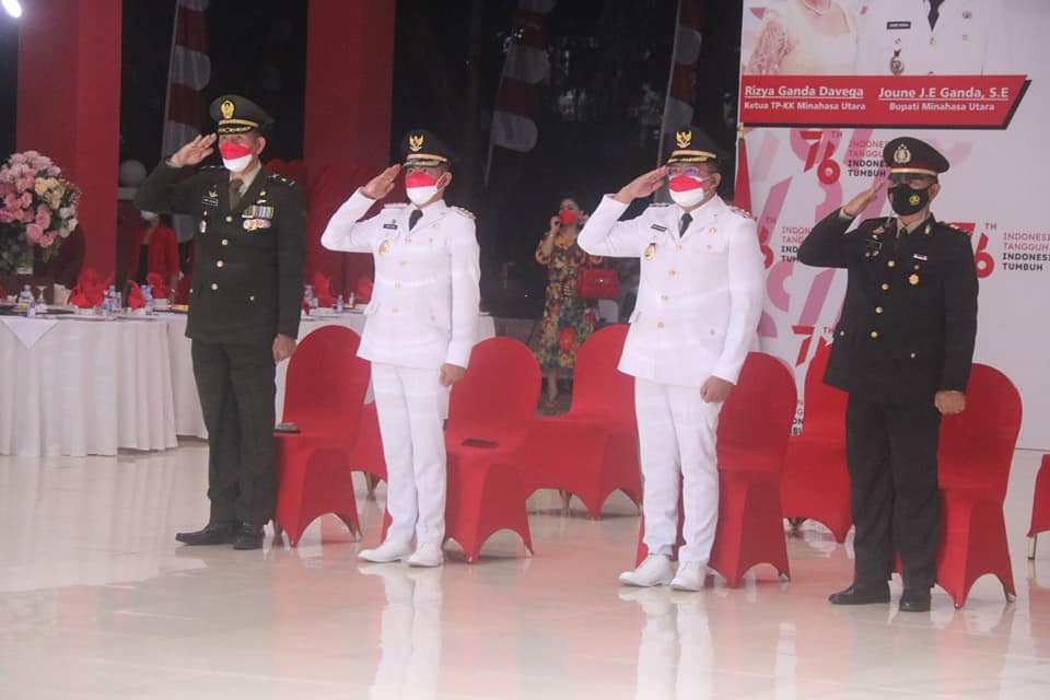 TNews, Minut – Jajaran pemerintah kabupaten Minahasa Utara (Minut) dipimpin bupati Joune Ganda, SE dan Wakil bupati Kevin W Lotulung, SH.MH beserta Forkopimda mengikuti upacara bendera perayaan Detik-Detik Proklamasi Kemerdekaan Republik Indonesia ke-76 dari Istana Merdeka Jakarta, Selasa (17/08/2021) melalui virtual live streaming di Pendopo Pemkab Minut.