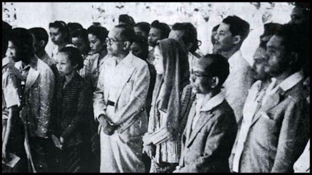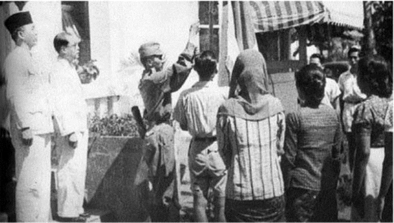 Upacara penaikan bendera Sang Merah Putih di halaman Gedung Pegangsaan Timur 56 (Gedung Proklamasi). Tampak antara lain Soekarno, Hatta, Latief Hendraningrat (menaikkan bendera), Ny. Fatmawati Soekarno dan Ny. SK Trimurti.
