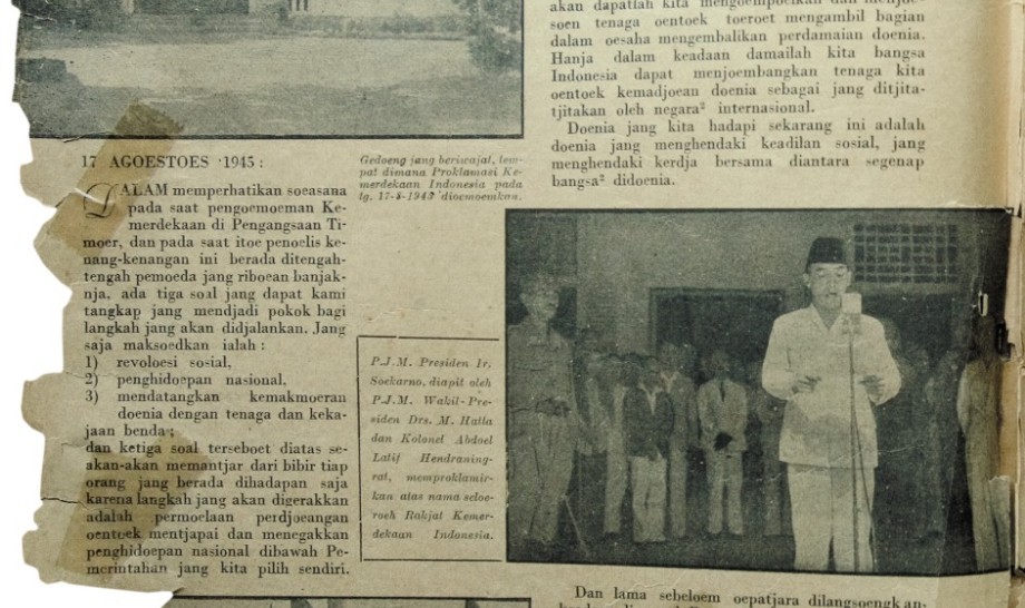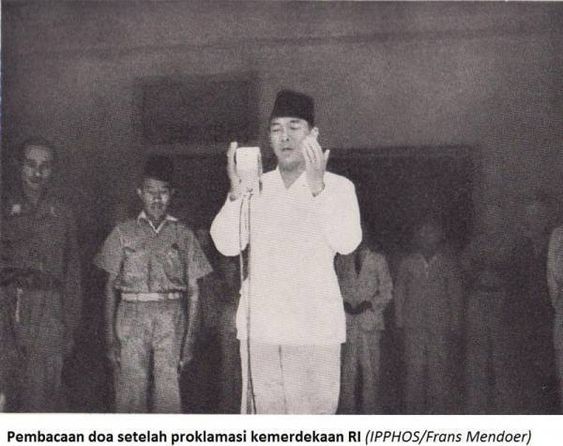 Foto Proklamasi Kemerdekaan Indonesia karya Frans Mendur dimuat pertama kali di harian Merdeka tanggal 20 Februari 1946, lebih dari setengah tahun setelah pembuatannya.