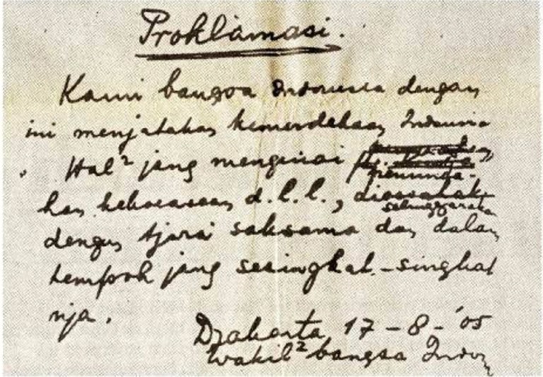 Kami bangsa Indonesia dengan ini menyatakan kemerdekaan Indonesia. Hal-hal yang mengenai pemindahan kekuasaan dan lain-lain diselenggarakan dengan cara seksama dan tempo yang sesingkat-singkatnya.