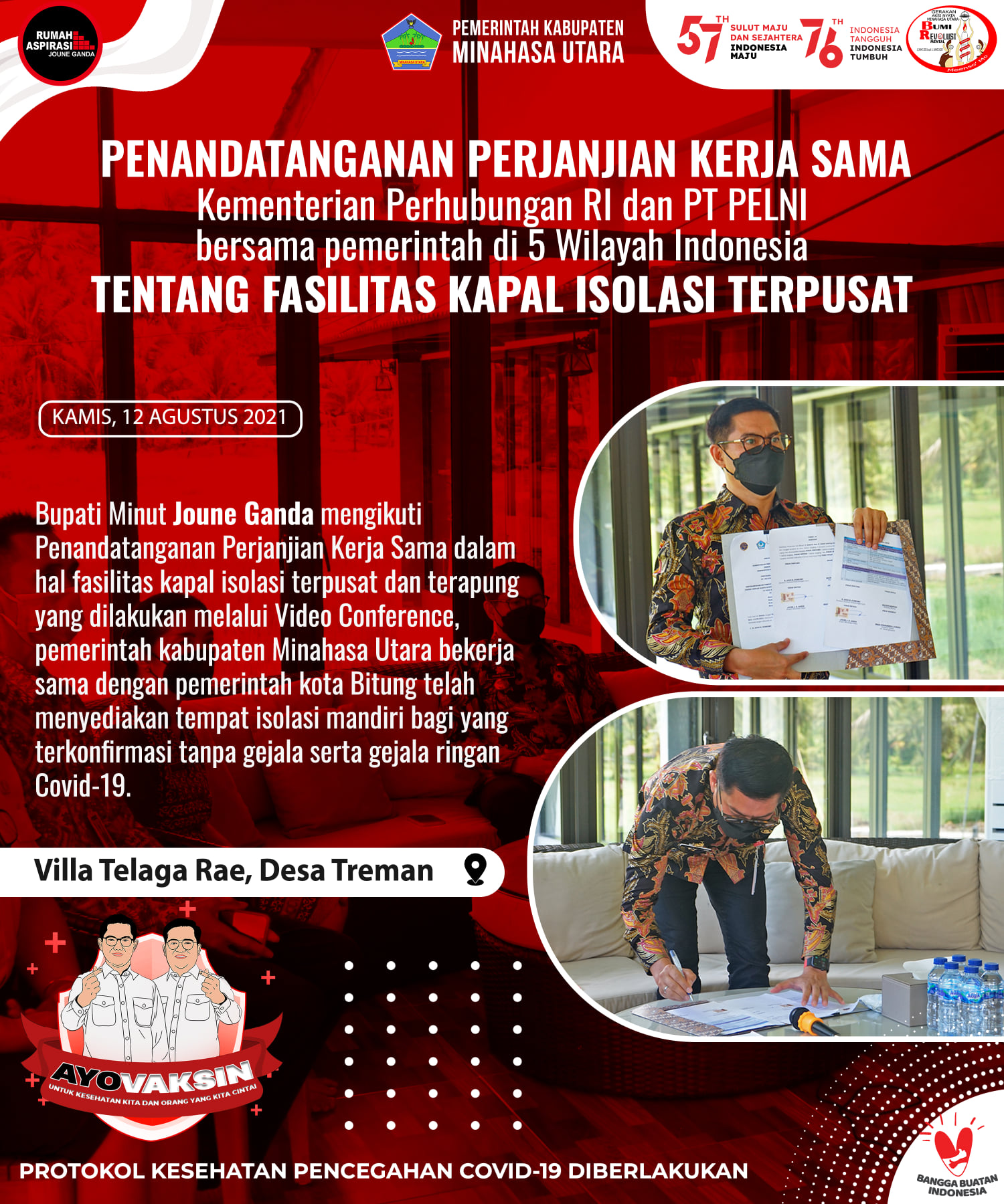 TNews, Minut- Keinginan memanfaatkan fasilitas KM. Tatamailau salah satu kapal penumpang milik PT. PELNI, sebagai lokasi Isolasi Mandiri terapung oleh pemerintah kabupaten Minahasa Utara (Minut), akhirnya terwujud dengan dilakukannya penandatanganan perjanjian kerjasama pemanfaatan KM. TATAMAILAU antara Kementerian Perhubungan RI dan PT Pelni (Persero) dan Pemkab Minut dalam hal ini Bupati Joune Ganda, SE. Kamis (12/08/2021) dan dilakukan secara Daring melalui ZoomMeeting.