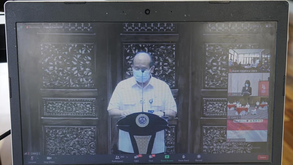 Bupati Joune Ganda dan jajaran instansi terkait Pemkab Minut mengikuti kegiatan secara Daring ini dari Villa Telaga Rae Minut.