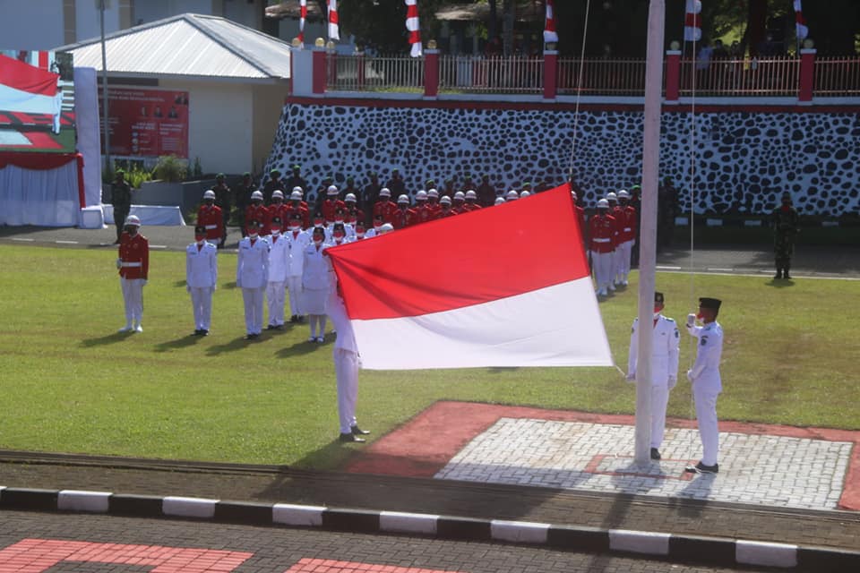 Dengan konsentrasi yang tinggi, JG sapaan akrab bupati kemudian menyerahkan bendera merah putih untuk di kibarkan oleh Graydi Kamuh, June Salenda, dan Meydi Mandias yang telah siap di bagian lain kelompok Paskibraka.