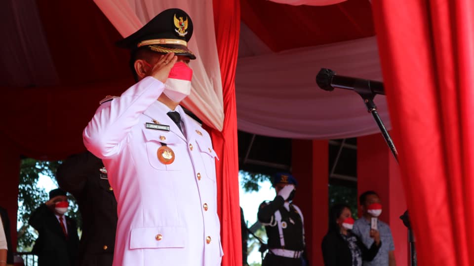 TNews, Minut – Tampak gagah dan berwibawa, adalah penampilan Bupati kabupaten MInahasa Utara (Minut) Joune JE Ganda, SE ketika mengenakan berpakain Pakaian Dinas Upacara, kala bertindak sebagai Inspektur Upacara (Irup) peringatan Detik-Detik Proklamasi Kemerdekaan Republik Indonesia Ke-76 kabupaten Minut di lapangan upacara Pemkab, Selasa (17/08/2021).