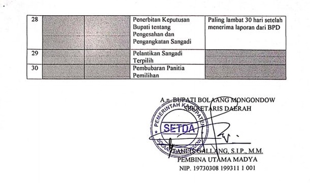 TNews, BOLMONG – Berdasarkan surat yang ditandatangani Sekda Bolaang Mongondow (Bolmong) Tahlis Gallang atas nama Bupati bernomor 100/D.24/DPMD/244/X/2021 tertanggal 22 Oktober 2021, Dinas Pemberdayaan Masyarakat dan Desa (DPMD) mulai merilis jadwal tahapan Penilihan Sangadi (Pilsang).