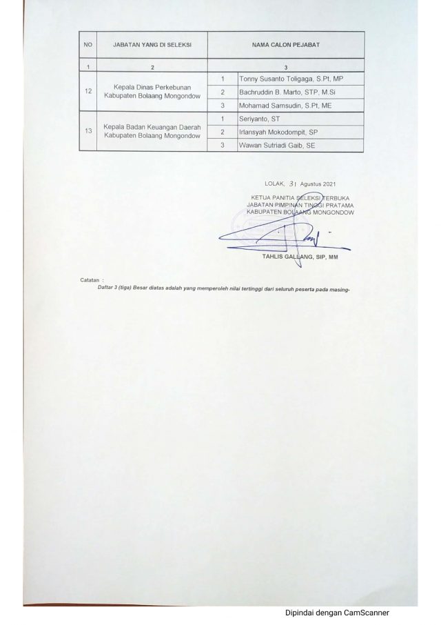 TNews, BOLMONG — Badan Kepegawaian Pendidikan dan Pelatihan (BKPP) Kabupaten Bolaang Mongondow (Bolmong) res mengumumkan jadwal pelaksanaan Seleksi Kompetensi Bidang (SKB), Calon Pegawai Negeri Sipil (CPNS) tahun 2021.