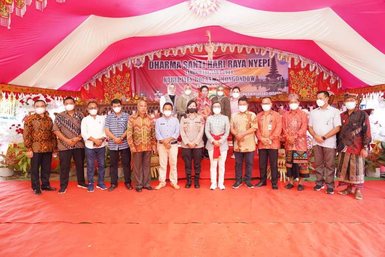 ADVETORIAL, BOLMONG – Bupati Kabupaten Bolaang Mongondow (Bolmong) Yasti Soepredjo Mokoagow menghadiri perayaan Dharma Santi Hari Raya Nyepi Tahun Baru Saka 1944, Jumat 1 April 2022.