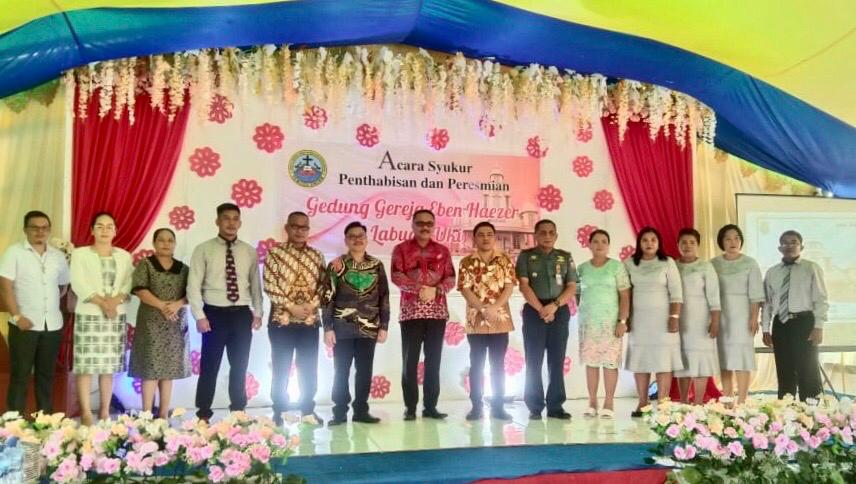 Pj Bupati Limi Mokodompit menandatangani prasasti sebagai tanda diresmikannya gereja Eben Haezer Labuan Uki sekaligus meninjau sarana dan prasarana gereja.