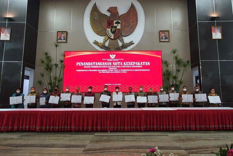 TNews, KOTAMOBAGU – Wali Kota Kotamobagu Ir. Hj. Tatong Bara, menghadiri Deklarasi Jejaring Panca Mandala (JPM) sekaligus melakukan penandatanganan Nota Kesepakatan antara Badan Pembinaan Ideologi Pancasila (BPIP) dan Pemerintah Daerah se-Sulawesi Utara, Kamis (14/7/2022), di Ruang Mapalus Kantor Gubernur Sulawesi Utara.