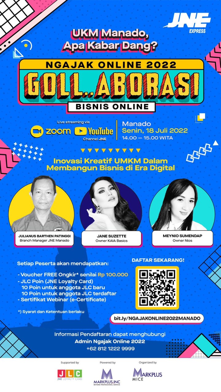 JNE dengan komitmen tetap peduli dengan pertumbuhan serta pengembangan UMKM, Senin (18/07/2022) kembali menggelar webinar bertajuk JNE Ngajak Online, Goll..Aborasi Bisnis Online Kota Manado.