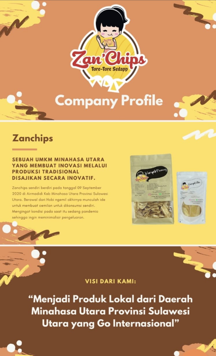 “6 produk ini dengam varian rasa yang berbeda, dan kami tetap berupaya mengembangkan varian dan rasa yang berbeda, mengikuti selara konsumen, sebab saat ini ZanChips selain dipasarkan secara Online, juga sudah merambah beberap daerah di Jawa, Bali dan daerah lain. Pada intinya keseluruhan produk dibuat secara traditional, dikemas secara modern dan tetap mempertahankan originalitas produk. Untuk kwalitas pasti baik karena sudah di lengkapi izin P-IRT yang artinya produk bisa di pasarkan, baik secara online via marketplace maupun prderan offline khusus oleh-oleh minahasa utara,” ungkap pemilik akun Instagram @ZANCHIP berpromosi. (Penulis Meiyer Tanod)