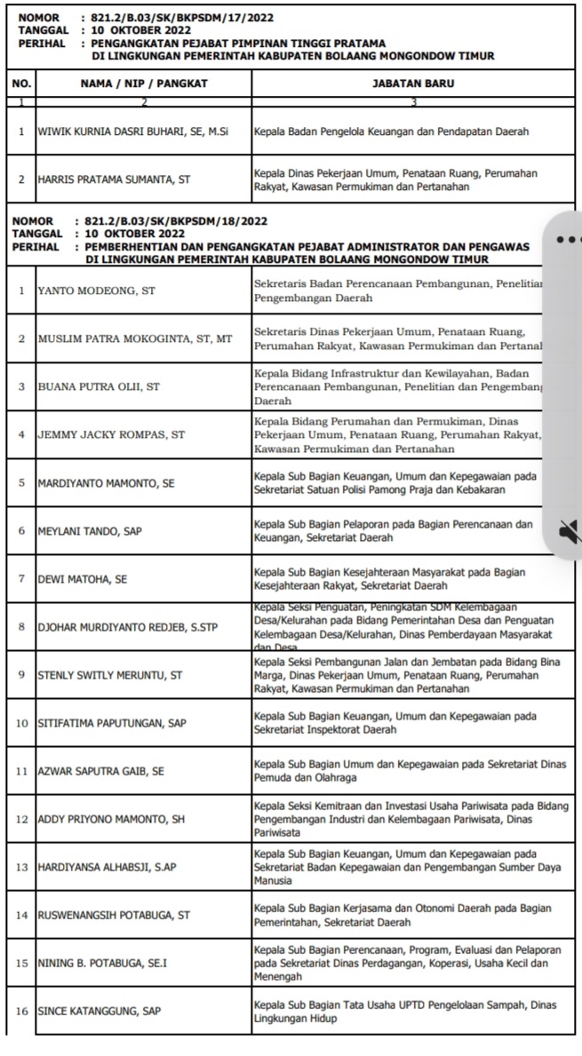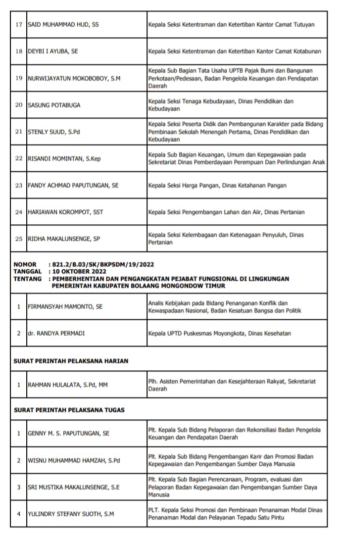 Pelantikan tersebut sesuai dengan Surat Keputusan (SK), nomor: 821.2/B.03/SK/BKPSDM/17/2022, perihal pengangkatan pejabat pimpinan tinggi pratama dilingkungan Pemkab Boltim dan SK, nomor: 821.2/B.03/SK/BKPSDM/18/2022, perihal pemberhentian dan pengangkatan pejabat administrator dan pengawas di lingkungan Pemkab Boltim serta SK, nomor: 821.2/B.03/SK/BKPSDM/19/2022, perihal pemberhentian dan pengangkatan pejabat fungsional dilingkungan Pemkab Boltim.