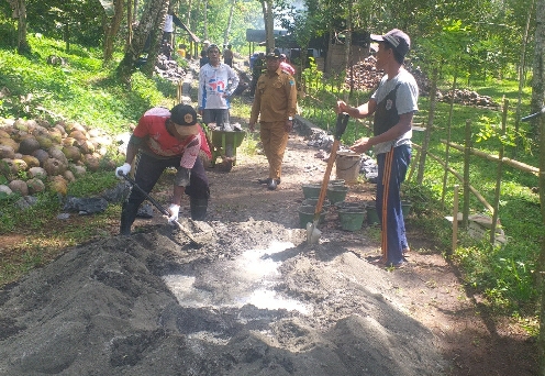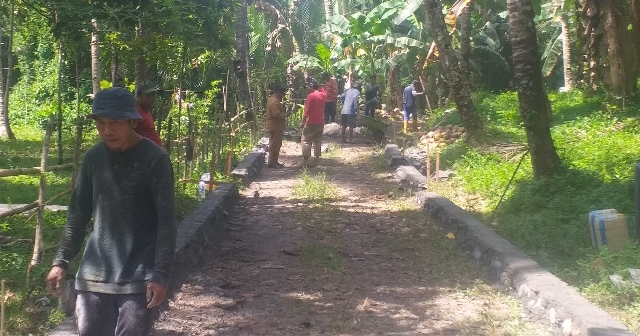 Terlihat di lapangan, pekerjaan sedang dilaksanakan oleh pekerja yang tak lain adalah warga desa, sebagai bentuk pemberdayaan, walaupun sering terhenti beberapa saat sebab mendahulukan aktivitas pertanian yang menggunakan akses jalan ini. (Penulis Meiyer Tanod)