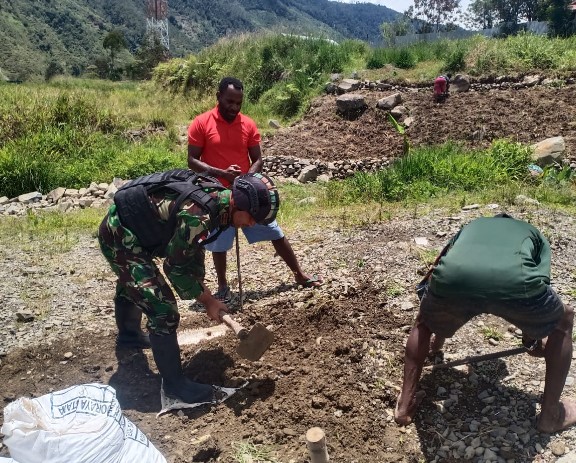 TNews, BIAK NUMFOR PAPUA – Anggota satgas Organik papua wilayah Puncak jaya melaksanakan kegiatan komunikasi sosial serta gotong royong membersihkan pekarangan rumah warga di Kampung Pruleme Distrik Mulia, Sabtu (22/10/ 2022).