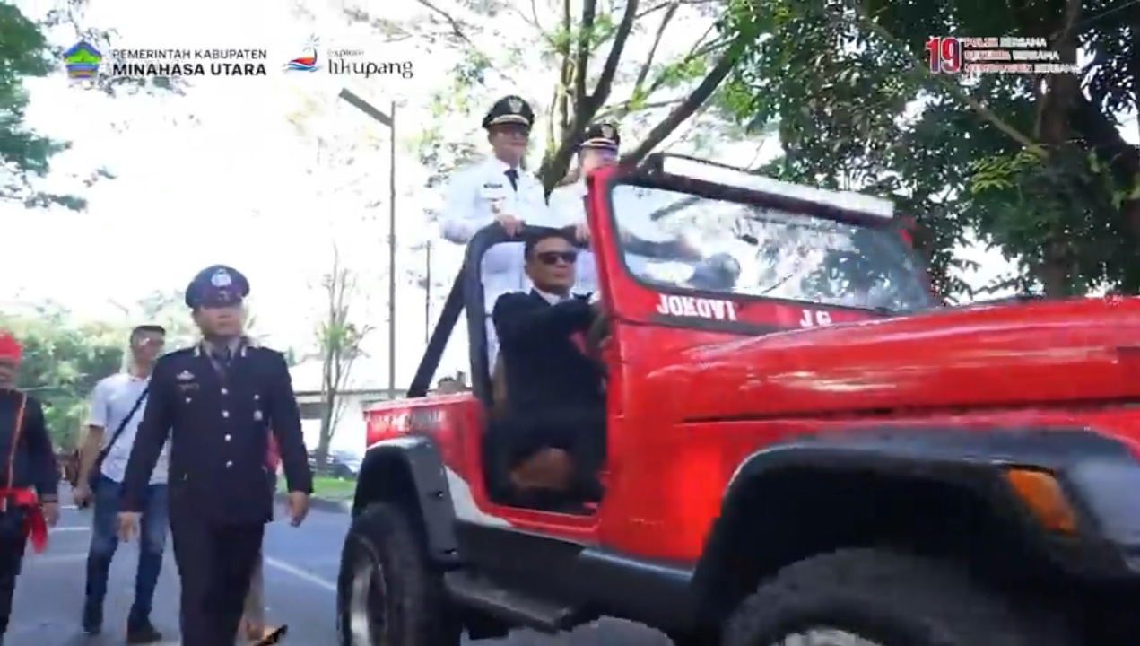 Publik terkesima dengan tampilan Bupati Joune Ganda dan Wakil Bupati Kevin Lotulung yang berkendara mobil Jeep, di iringi jajaran Pemkab Minut, mendatangi lokasi upacara dengan kawalan Drumband taruna IPDN Sulawesi Utara.