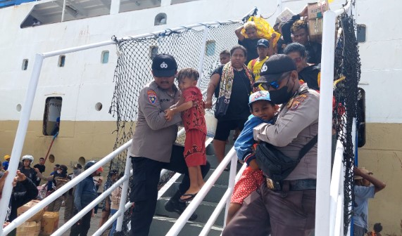TNews, BIAK NUMFOR – Personil Sub Sektor Kawasan Laut Polres Biak Numfor melaksanakan pengamanan arus mudik jelang perayaan Natal saat Kapal KM. Labobar bersandar di Pelabuhan Biak,Selasa (20/12/2022).