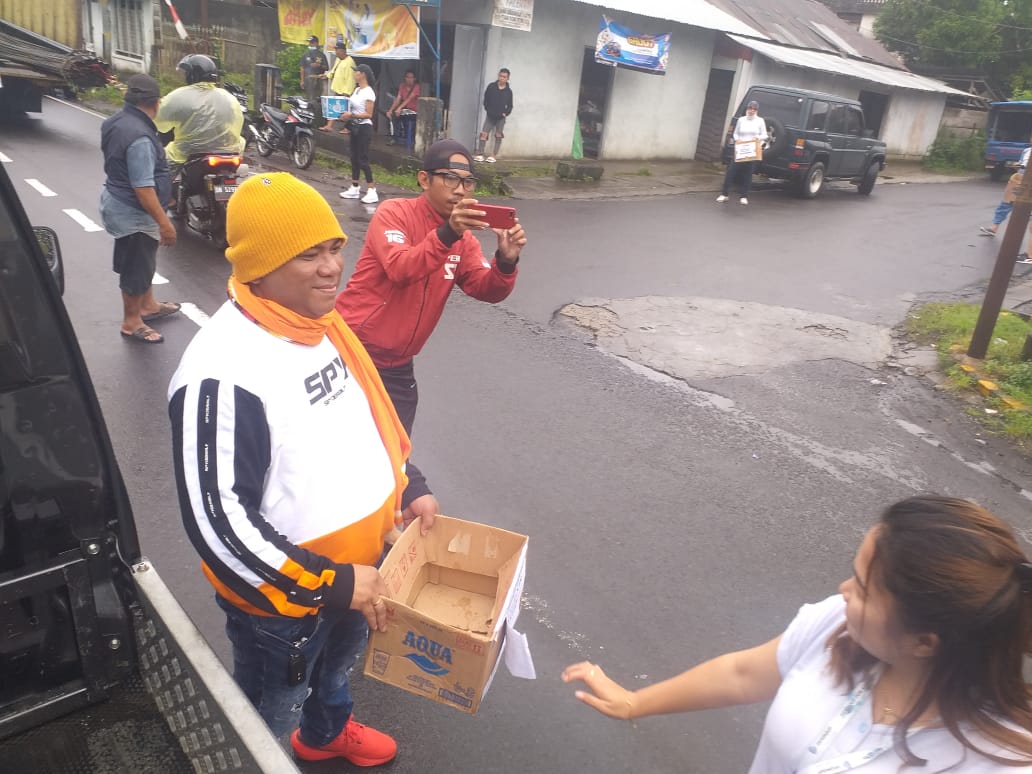 Walaupun sempat diguyur hujan, aksi kemanusiaan tetap berlanjut, bahkan Ishak Tambani turun ke jalan menenteng kotak sumbangan dari bekas kemasan Mie Instan, menyodorkan kepada pengendara Sepeda motor dan Pengemudi Mobil yang kebetulan melitas di ruas utama, Sukur – Likupang ini.