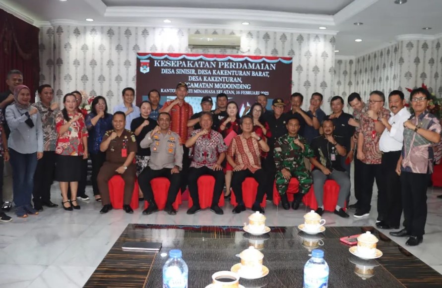 TNews, MINSEL – Pemerintah desa, tokoh masyarakat, tokoh agama Desa Sinisir dan Desa Kakenturan Raya (Desa Kakenturan dan Desa Kakenturan Barat), Kec. Modoinding, Kabupaten Minahasa Selatan (Minsel), resmi menandatangani kesepakatan perdamaian, Kamis (16/02/2023).