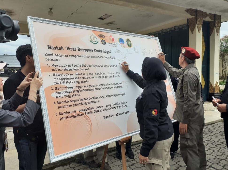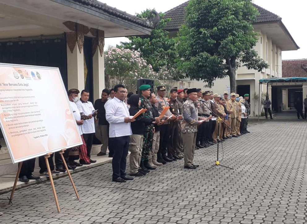 TNews, YOGYAKARTA – Bawaslu Yogyakarta bersama sejumlah elemen masyarakat menandatangi dan mendeklarasikan Pemilu Damai.