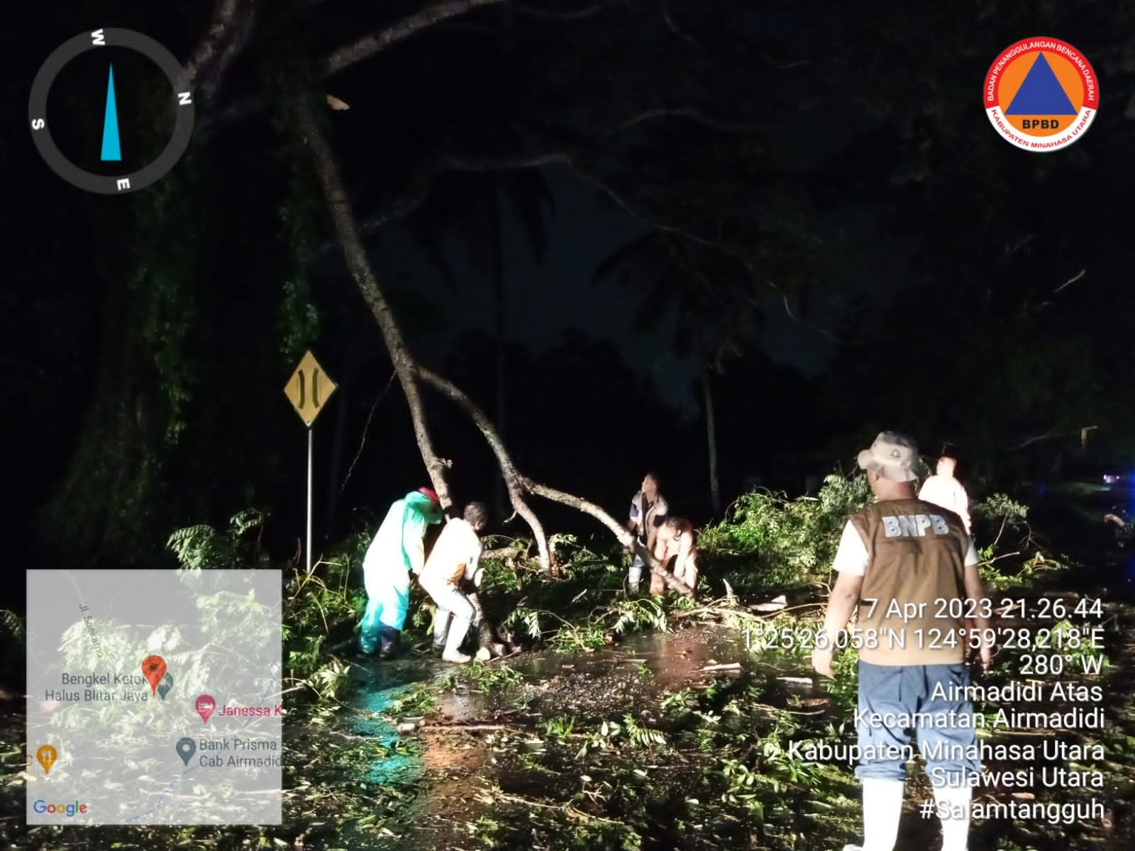 TNews, Minut Sulawesi Utara – Kesiap siagaan personil Badan Penanggunglangan Bencana daerah Minahasa Utara dibahwa komando Kepala Pelaksana Drs. Theodore Luingkewas, MM kembali terbukti, secara sigap melakukan normalisasi ruas jalan Soekarno di RW 14 Kelurahan Airmadidi Atas, yang terganggu arus lalu lintasnya, akibat tumbangnya pohon di empat titik yangb terjadi Jumat, (07/04/2023) sekira pukul 19.55 malam ini.