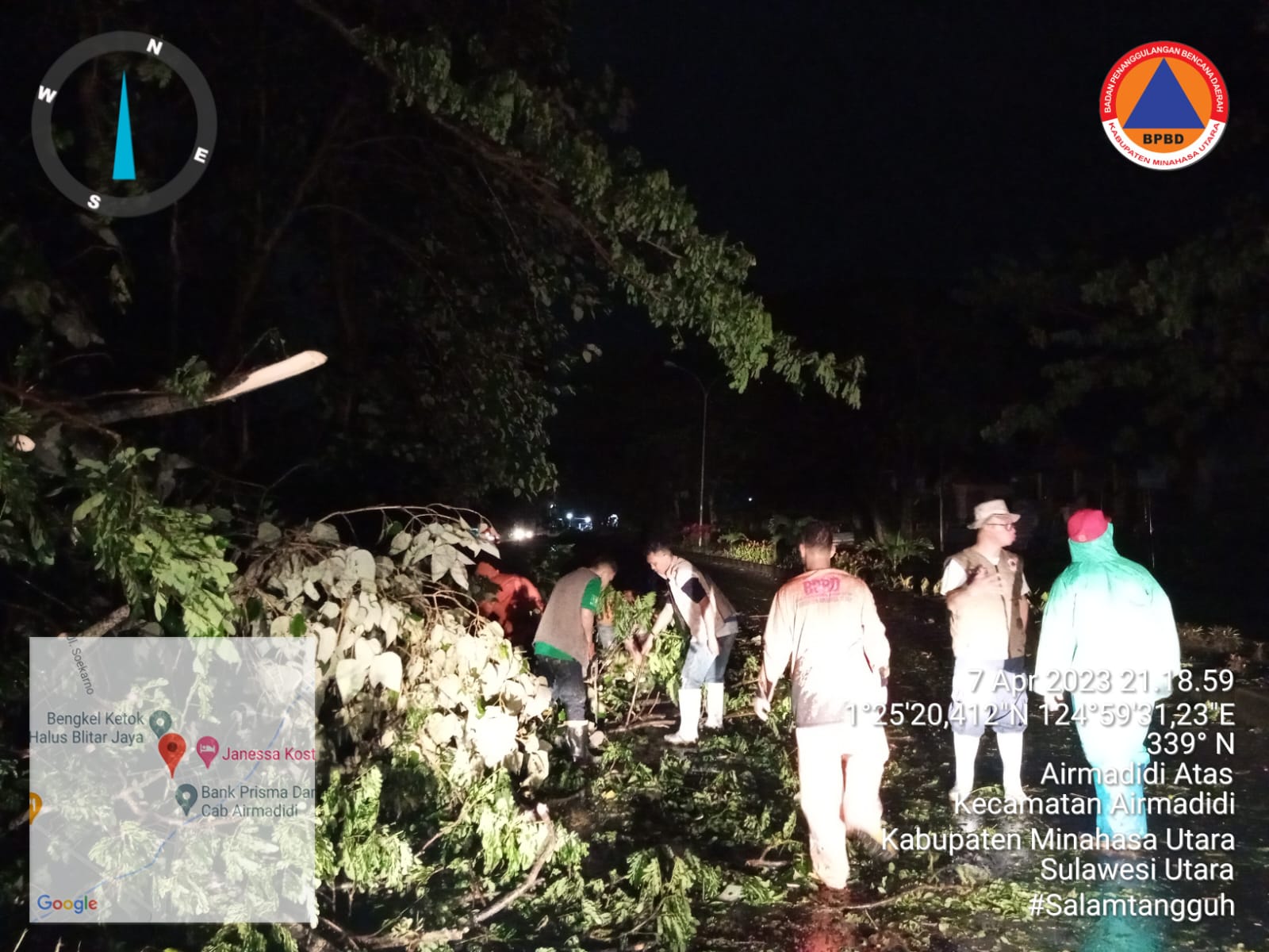 TNews, Minut Sulawesi Utara – Kesiap siagaan personil Badan Penanggunglangan Bencana daerah Minahasa Utara dibahwa komando Kepala Pelaksana Drs. Theodore Luingkewas, MM kembali terbukti, secara sigap melakukan normalisasi ruas jalan Soekarno di RW 14 Kelurahan Airmadidi Atas, yang terganggu arus lalu lintasnya, akibat tumbangnya pohon di empat titik yangb terjadi Jumat, (07/04/2023) sekira pukul 19.55 malam ini.