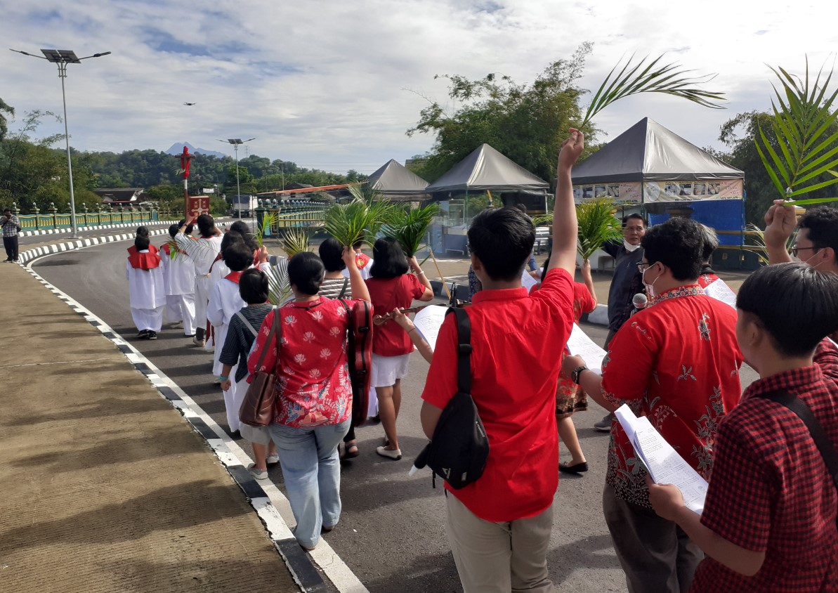Sepanjang perarakan Romo dan umat menyanyikan pujian sembari melambaikan daun palma. Ini untuk mengenang masuknya Yesus ke Yerusalem sebelum mengalami sengsara, wafat dan bangkit.