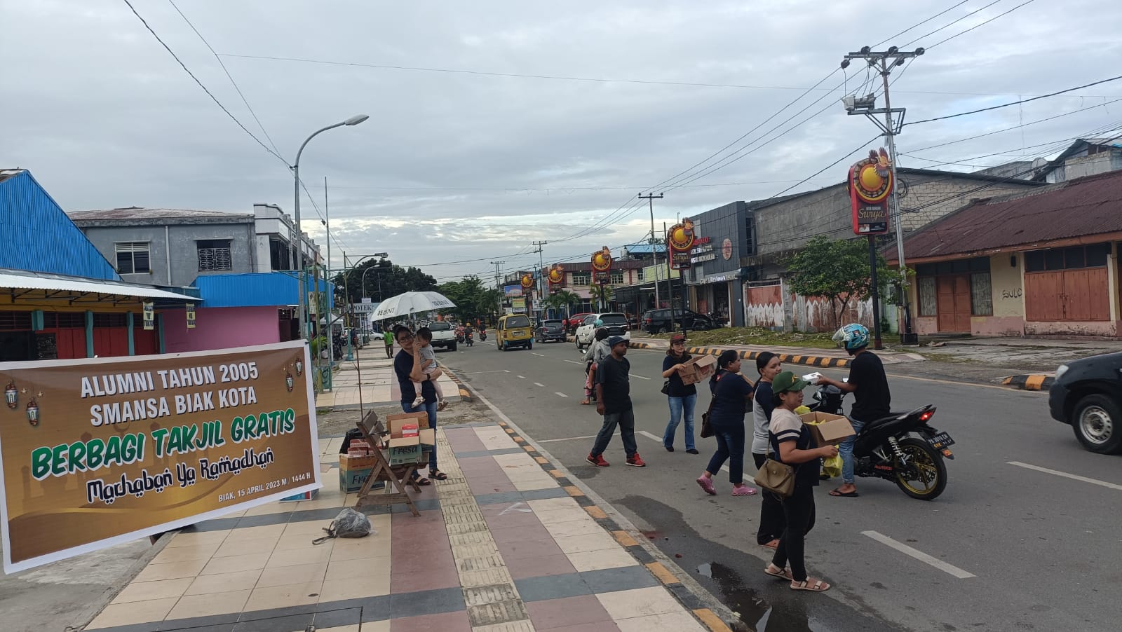 TNews, Biak – Alumni Tahun 2005 SMA Negeri 1 (Smansa) Biak Kota membagikan ratusan takjil gratis bagi masyarakat khususnya bagi umat muslim yang tengah menjalankan Ibadah Puasa Ramadhan 1444 H, pembagian takjil ini dipusatkan di Jalan Imam Bonjol Kabupaten Biak Numfor. Sabtu (15/04/2023).