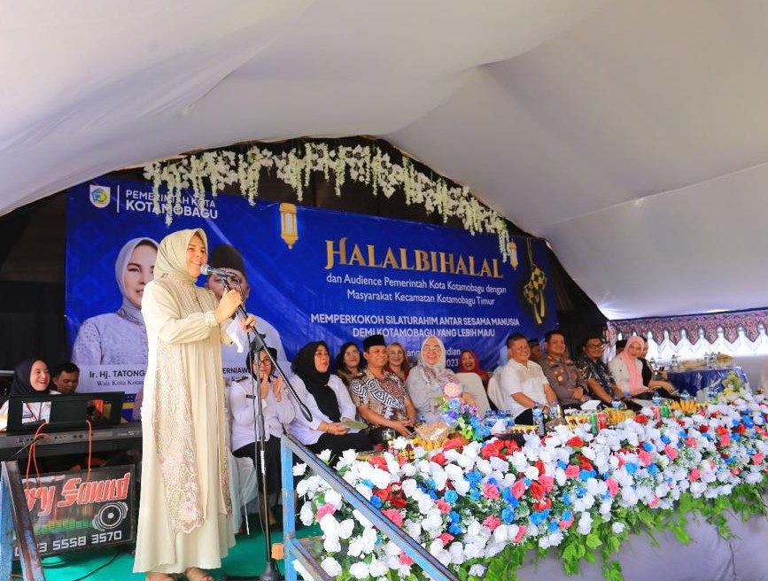 TNews, KOTAMOBAGU —Wali Kota Kotamobagu, Ir. Hj. Tatong Bara menghadiri pelaksanaan kegiatan Halal Bihalal yang dirangkaikan dengan audience pemerintah Kota Kotamobagu bersama masyarakat Kecamatan Kotamobagu Timur, Rabu (10/5).