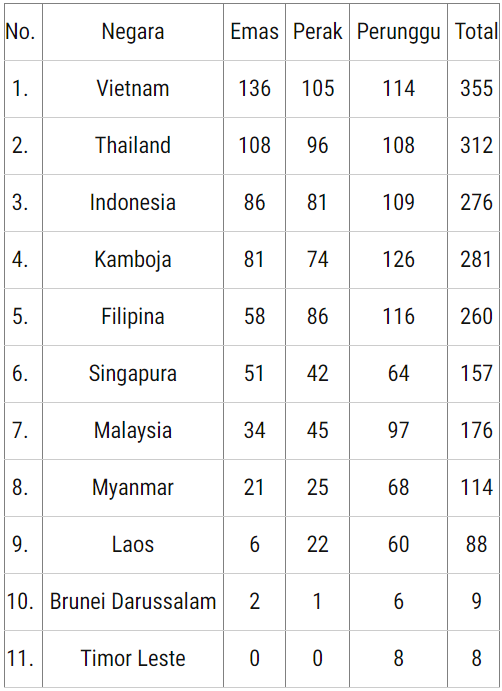 Berikut perolehan medali SEA Games 2023 pada Selasa (16/5) pukul 22.30 WIB (tidak ada perbedaan waktu dengan Kamboja) menurut laman resmi panitia SEA Games 2023 Kamboja (CAMSOC) games.cambodia2023.com.
