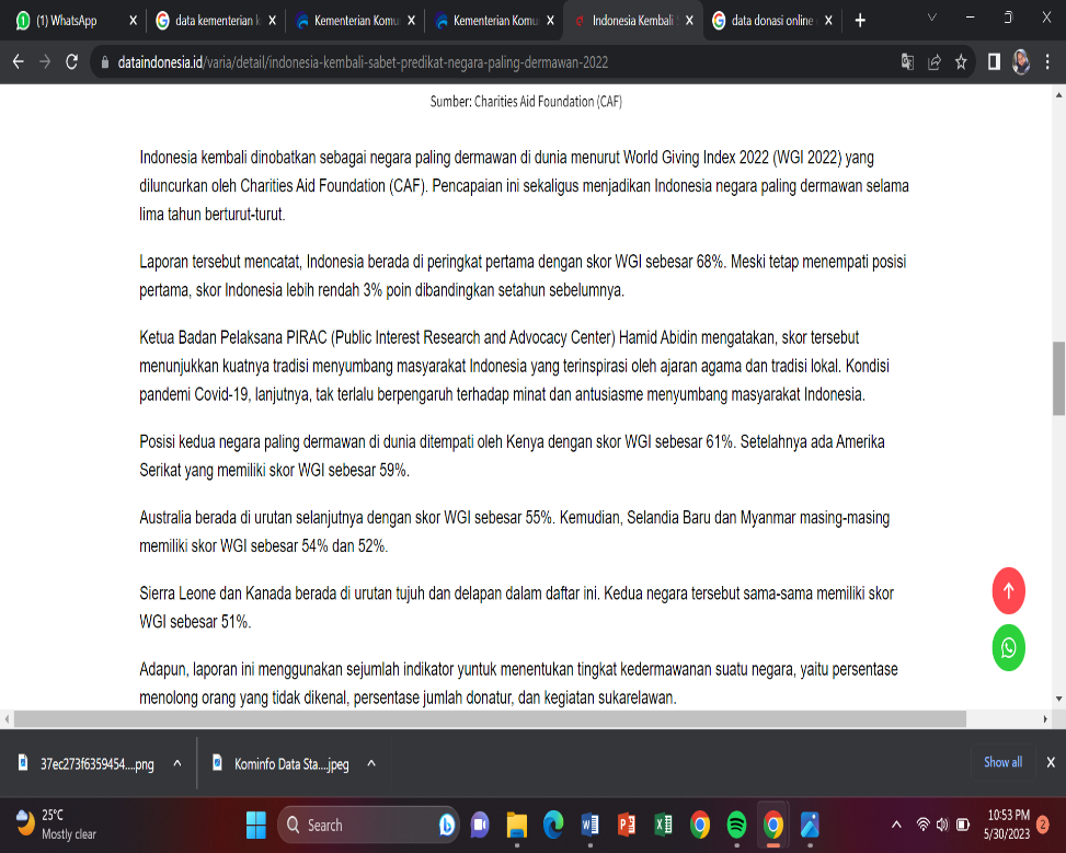 Tangkapan layar yang menunjukan negara Indonesia merupakan negara paling dermawan (Sumber : Dataindonesia.id)