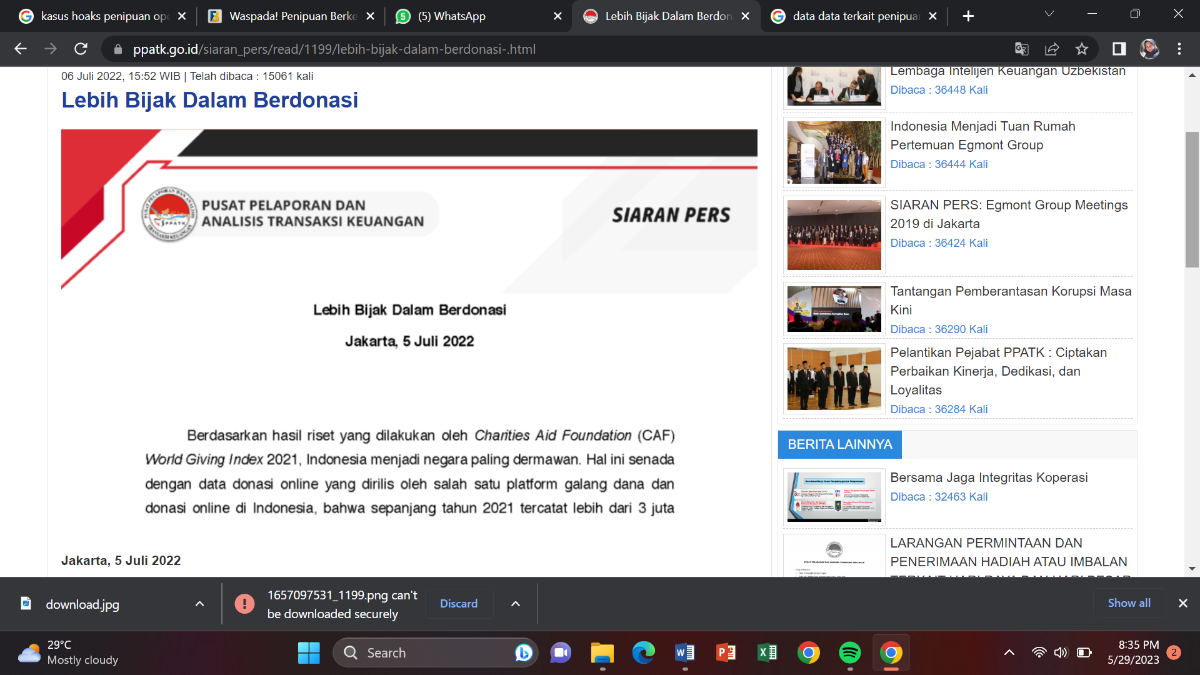 Tangkapan layar dari kanal situs PPATK terkait himbauan agar lebih bijak dalam berdonasi (Sumber : Pusat Pelaporan Analisis Transaksi Keuangan)