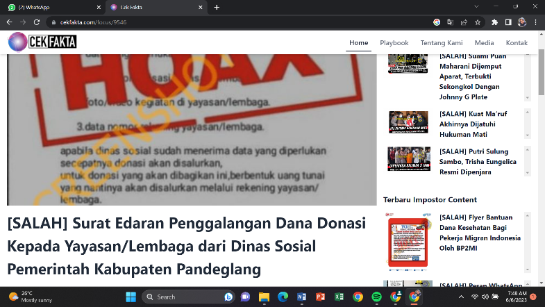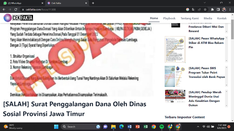 Seperti hoaks open donasi yang sempat tersebar pada tanggal 4 November tahun 2022 dimana pada saat itu beredar surat edaran yang ditandatangani oleh Kepala Dinas Sosial Provinsi Jawa Barat. Surat tersebut berisi informasi mengenai penggalangan donasi bantuan pelunasan pelayanan kesejahteraan sosial kepada yayasan atau lembaga.
