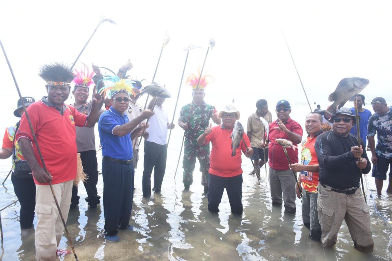 TNews, Biak – Snap Mor atau kegiatan menangkap ikan bersama-sama di waktu air surut dengan menggunakan tombak (kalawai) di pusatkan di tiga lokasi berbeda, di hari ketiga pelaksanaan Festival Biak Munara Wampasi (FBMW) Tahun 2023, Senin (03/07/2023)
