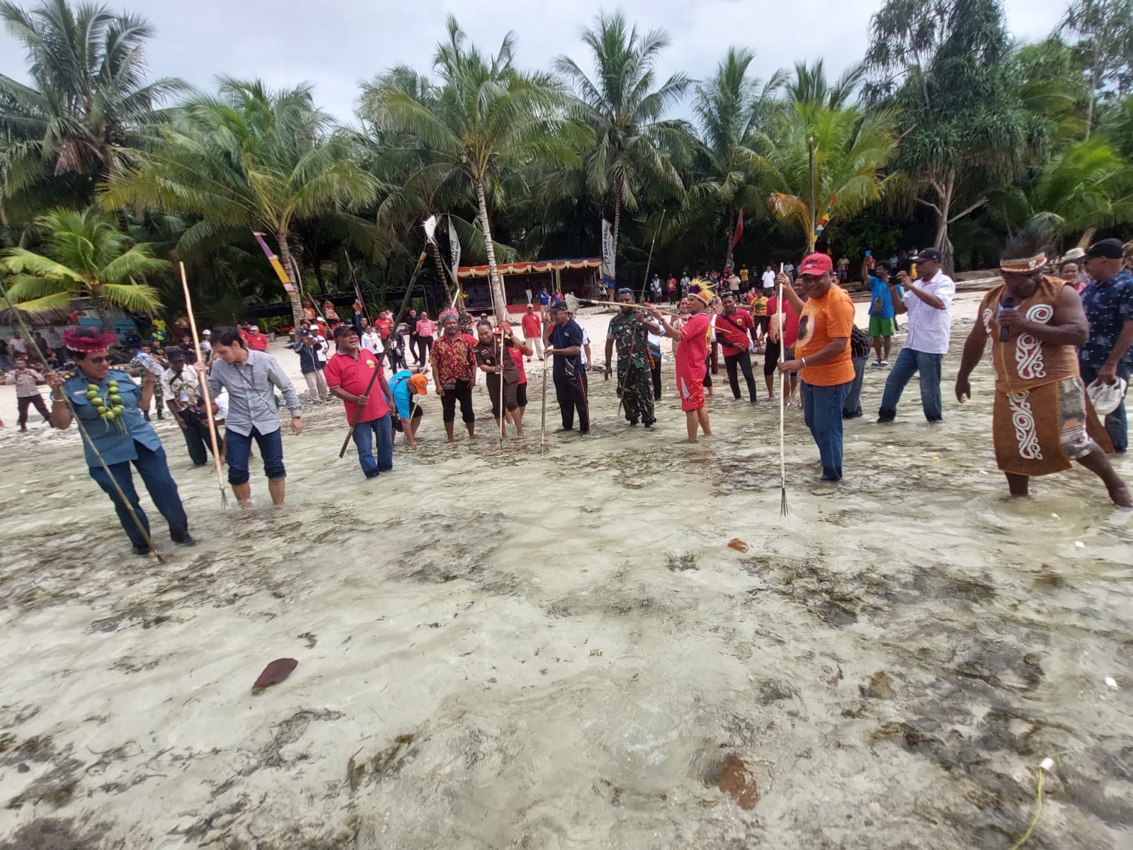 TNews, Biak – Snap Mor atau kegiatan menangkap ikan bersama-sama di waktu air surut dengan menggunakan tombak (kalawai) di pusatkan di tiga lokasi berbeda, di hari ketiga pelaksanaan Festival Biak Munara Wampasi (FBMW) Tahun 2023, Senin (03/07/2023)