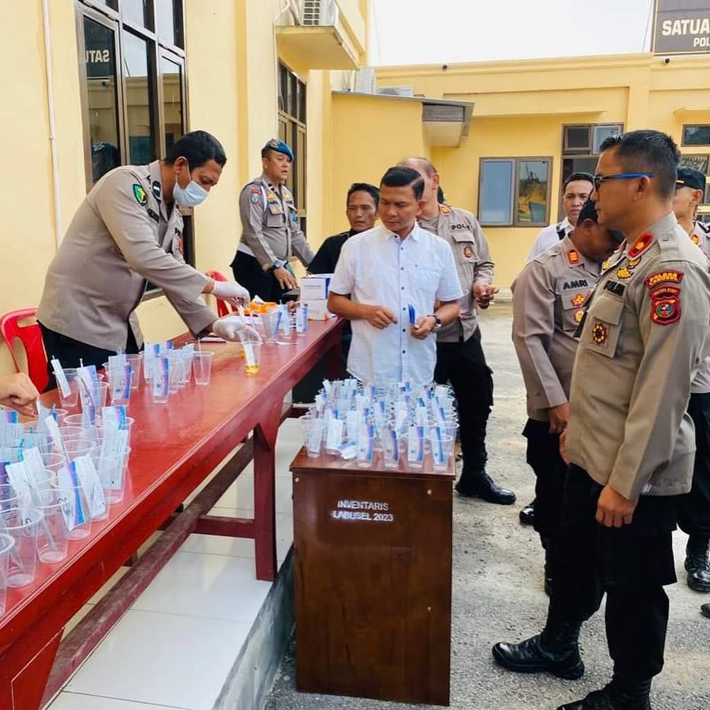 “Pada kesempatan ini, jajaran Polres Labusel melaksanakan test urine kepada 150 Anggota, mulai dari Kapolres, Wakapolres, Kabag, Kasat dan Kapolsek serta Anggota, untuk memastikan tidak ada lagi personel Polres Labusel yang menyalahgunakan narkoba, sebagaimana arahan Bapak Kapolda Sumut, bahwa Narkoba Musuh Bersama”, ujar Kapolres Labusel, AKBP Catur Sungkowo.