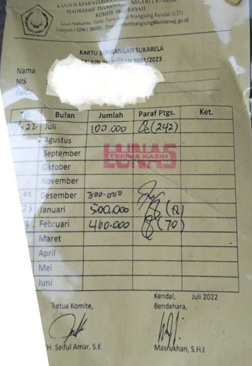 TNews, KENDAL – Dunia Pendidikan nampaknya masih diwarnai dengan pungutan liar (Pungli). Hal ini diduga masih terjadi di MTSN 1 Kendal yang diduga kuat melakukan pungli dengan cara meminta uang kenang-kenangan sebesar kurang lebih Rp. 250-300 ribu rupiah per-siswa yang lulus tahun 2023.