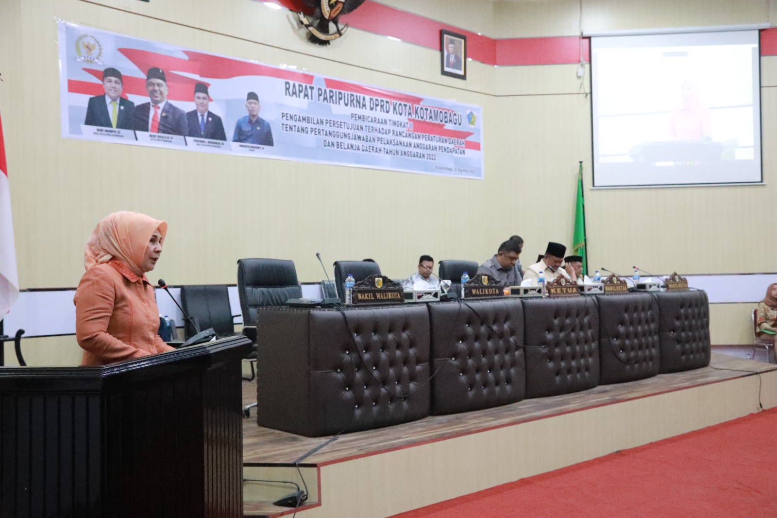TNews, KOTAMOBAGU – Wali Kota Kotamobagu, Ir. Hj. Tatong Bara menghadiri Rapat Paripurna DPRD Kota Kotamobagu dalam rangka Pembicaraan Tingkat II Pengambilan Persetujuan Terhadap Rancangan Peraturan Daerah (Ranperda) Tentang Pertanggungjawaban Pelaksanaan APBD Tahun Anggaran 2022, Jumat (25/8).