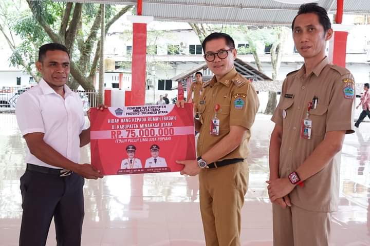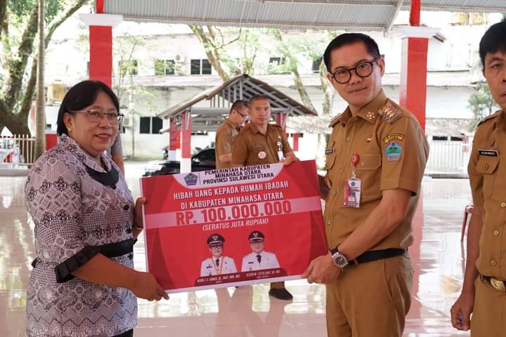 TNews, Minut Sulawesi Utara – Pemerintah Kabupaten Minahasa Utara (Minut) di bawah kepemimpinan Bupati Joune J.E. Ganda, S.E.,M.A.P.,M.M., M.Si dan Wakil Bupati Kevin William Lotulung, S.H., M.H., (JGKWL), Senin (18/09/2023), kembali merealisasikan komitmen yang tertuang dalam visi dan misi yakni menyerahkan bantuan bagi pembangunan rumah ibadah di Minut.