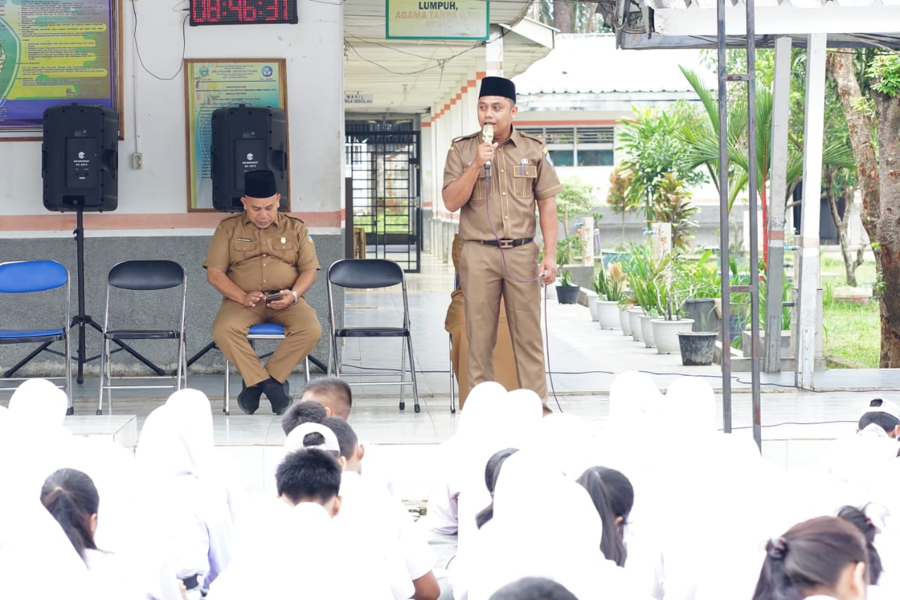 Usai upacara, Plt. Kepala Dinas Kominfo menjadi Narasumber pada kegiatan belajar siswa kelas X di SMA N 1 Rantau Utara.
