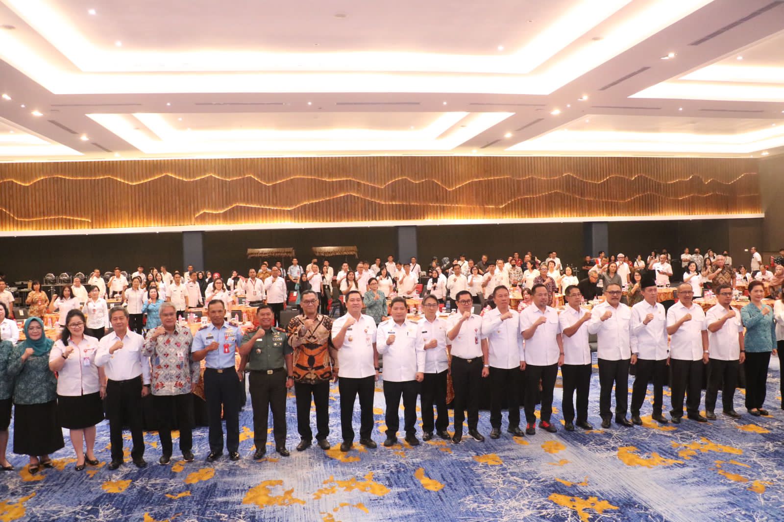 Hadir dalam kegiatan ini Gubernur Sulawesi Utara yang diwakili oleh Wakil Gubernur Sulawesi Utara Bapak Drs. Steven O. E. Kandouw, Direktur Jenderal Bina Pembangunan Daerah Kemendagri yang diwakili oleh Direktur Sinkronisasi Urusan Pemerintahan Daerah III Ibu Dr. Dra. Hj. Erliani Budi Lestari, M.Si., yang hadir secara daring, Kepala BKKBN RI yang diwakili oleh Pejabat Fungsional Utama BKKBN RI Bapak drg. Widwioni, M.Kes., Forkopimda Provinsi Sulawesi Utara, Bupati dan Wali Kota serta Wakil Bupati dan Wakil Wali Kota se-Provinsi Sulawesi Utara, Kepala Perwakilan BKKBN Provinsi Sulawesi Utara Bapak Ir. Diano Tino Tandaju, M.Erg., bersama jajaran, Ketua TP PKK Kabupaten/Kota, Kepala Perangkat Daerah yang membidangi Perencanaan dan PPKB Kabupaten dan Kota se-Provinsi Sulawesi Utara, akademisi, pimpinan dunia usaha, BUMN/BUMD, dan perbankan.