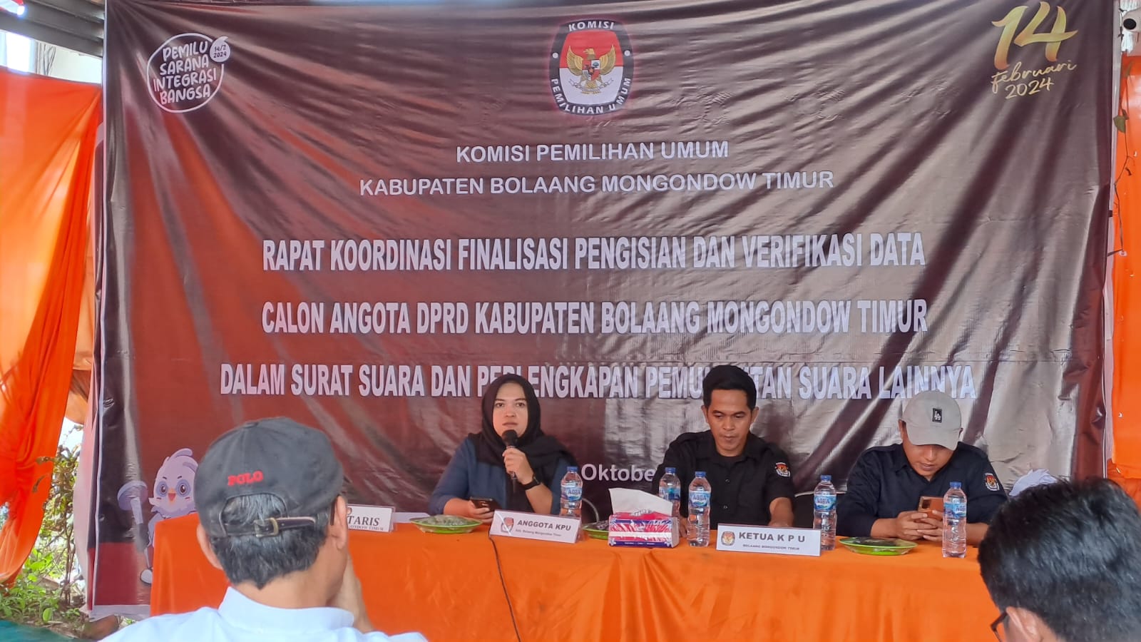 Pada kesempatan itu Ketua Komisi Pemilihan Umum Kabupaten Bolaang Mongondow Timur, Rusmin Mamonto melalui Kepala kepala Divisi Hukum dan Pengawasan Pak Wardoyo Elias SPd membuka secara resmi kegiatan rapat koordinasi finalisasi pengisian dan verifikasi data calon anggota DPRD Kabupaten Bolaang Mongondow Timur dalam surat suara dan perlengkapan pemungutan suara lainnya.