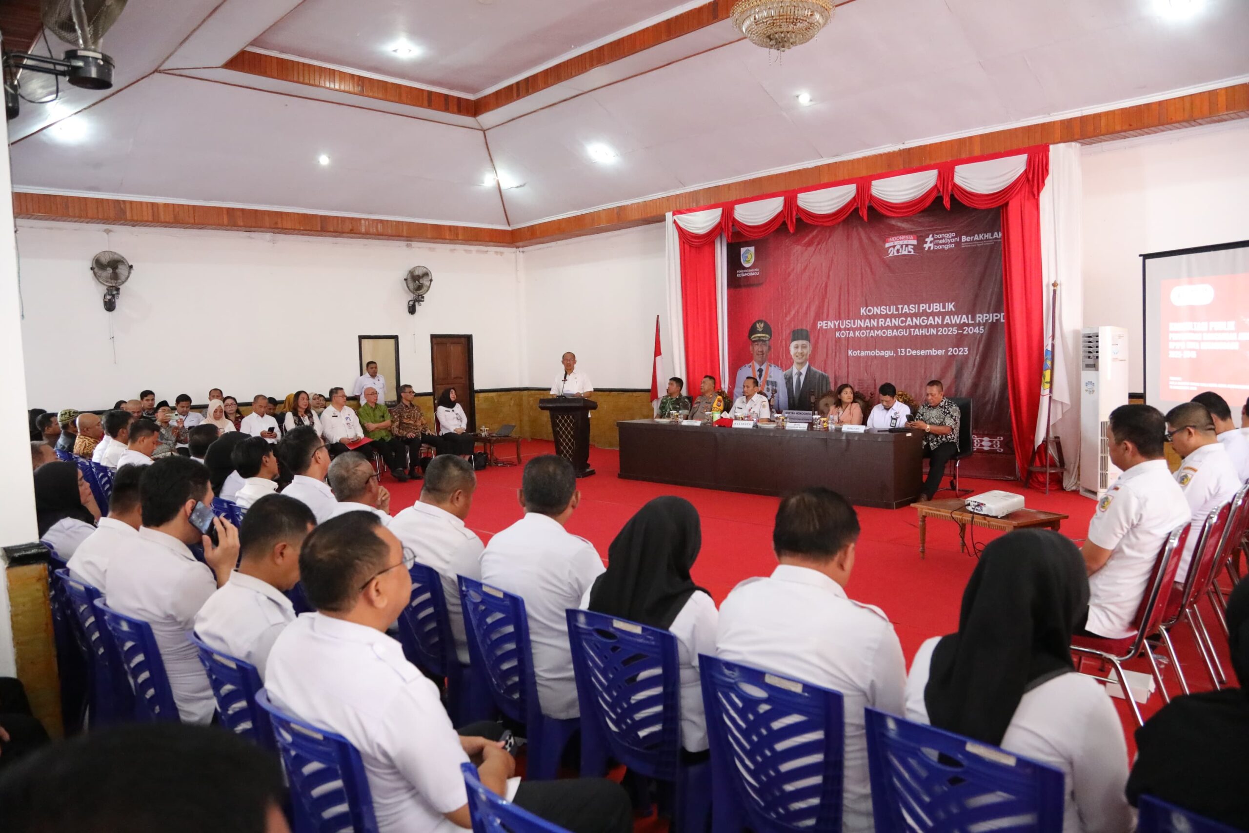 TNews, KOTAMOBAGU – Penjabat (Pj) Wali Kota Kotamobagu, Dr. Drs. Hi. Asripan Nani M.Si., membuka secara resmi Forum Konsultasi Publik Penyusunan Rancangan Awal (Ranwal) Rencana Pembangunan Jangka Panjang Daerah (RPJPD) Kota Kotamobagu 2025 – 2045, bertempat di Aula Rumah Dinas Wali Kota Kotamobagu, Rabu (13/12/1023).