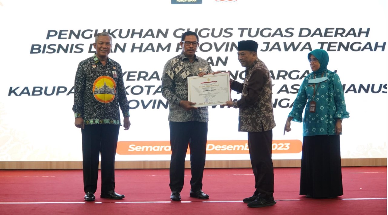 Dari beberapa indikator itu, Kabupaten Jepara mendapat nilai 90,9 poin. Penyerahan penghargaan tersebut, juga terangkai dengan pengukuhan Gugus Tugas Daerah Bisnis dan HAM Provinsi Jawa Tengah.