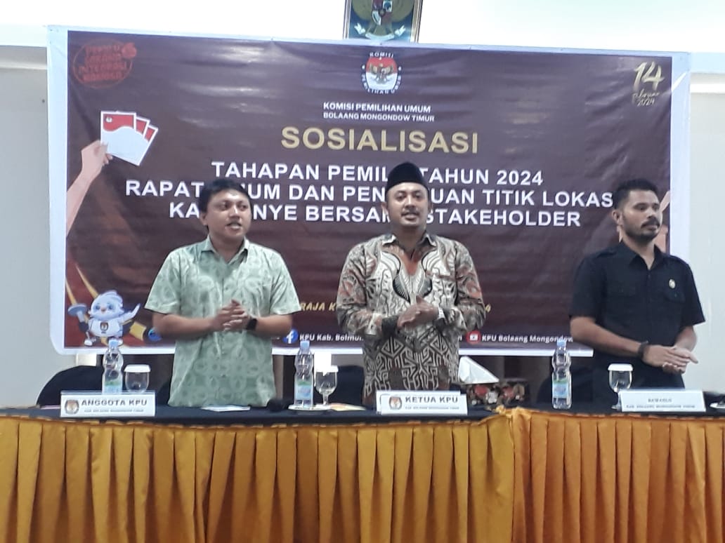 Menurut Plh Ketua KPU Boltim Ikal Salehe kegiatan Sosialisasi ini sesuai Undang-Undang Nomor 7 Tahun 2017 tentang Pemilihan Umum, peraturan KPU nomor 3 tahun 2022 tentang tahapan dan jadwal penyelenggaraan pemilu tahun 2024 (Berita negara RI tahun 2022 nomor 574), serta pasal 26 ayat (1) huruf (f dan g) peraturan KPU nomor 15 tahun 2023 tentang Kampanye Pemilu, “Maka KPU Kabupaten Boltim mengadakan kegiatan sosialisasi tahapan pemilu tahun 2024, serta penentuan titik lokasi kampanye rapat umum bersama Bawaslu, stakeholder, parpol, media, dan pemantau pemilu,” jelas Ical.