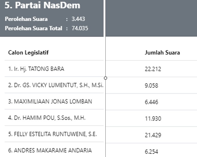Di mana perolehan suara Tatong Bara 22.212 suara, melampaui suara Felly Runtuwene yang hanya memperoleh 21.429.