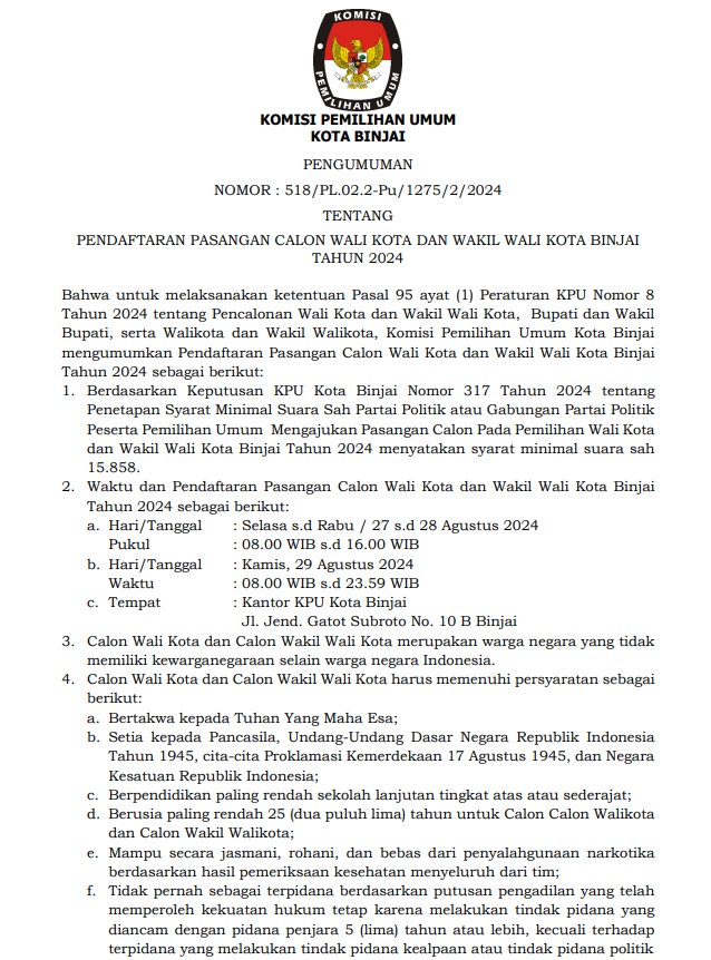 Pengumuman Pendaftaran Pasangan Calon Wali Kota dan Wakil Wali Kota Binjai Tahun 2024