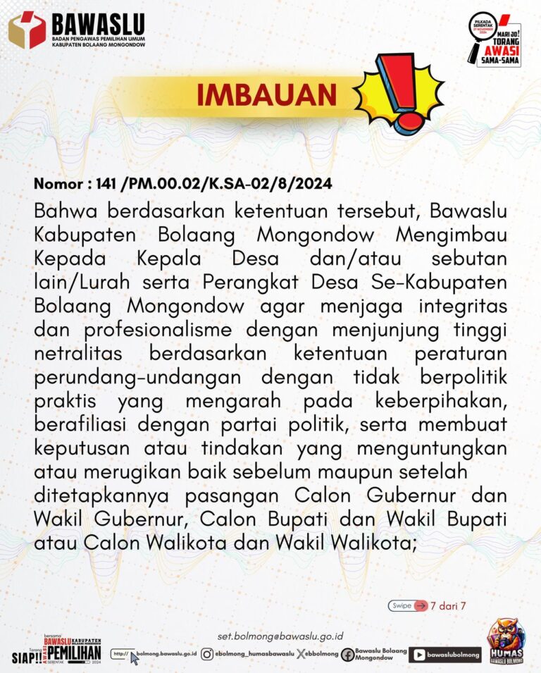 Imbauan ini diharapkan dapat memastikan Pilkada 2024 di Kabupaten Bolaang Mongondow berlangsung secara adil, transparan, dan sesuai dengan ketentuan yang berlaku.*