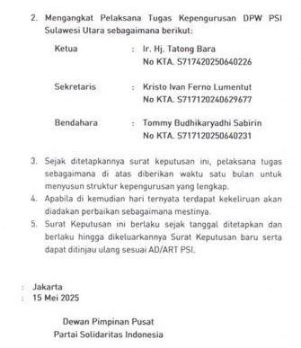 Surat keputusan tersebut lengkap dengan penunjukan dua figur lainnya yang akan mendampingi Tatong: Kristo Ivan Ferno Lumentut sebagai Sekretaris dan Tommy Budhikaryadhi Sabirin sebagai Bendahara.