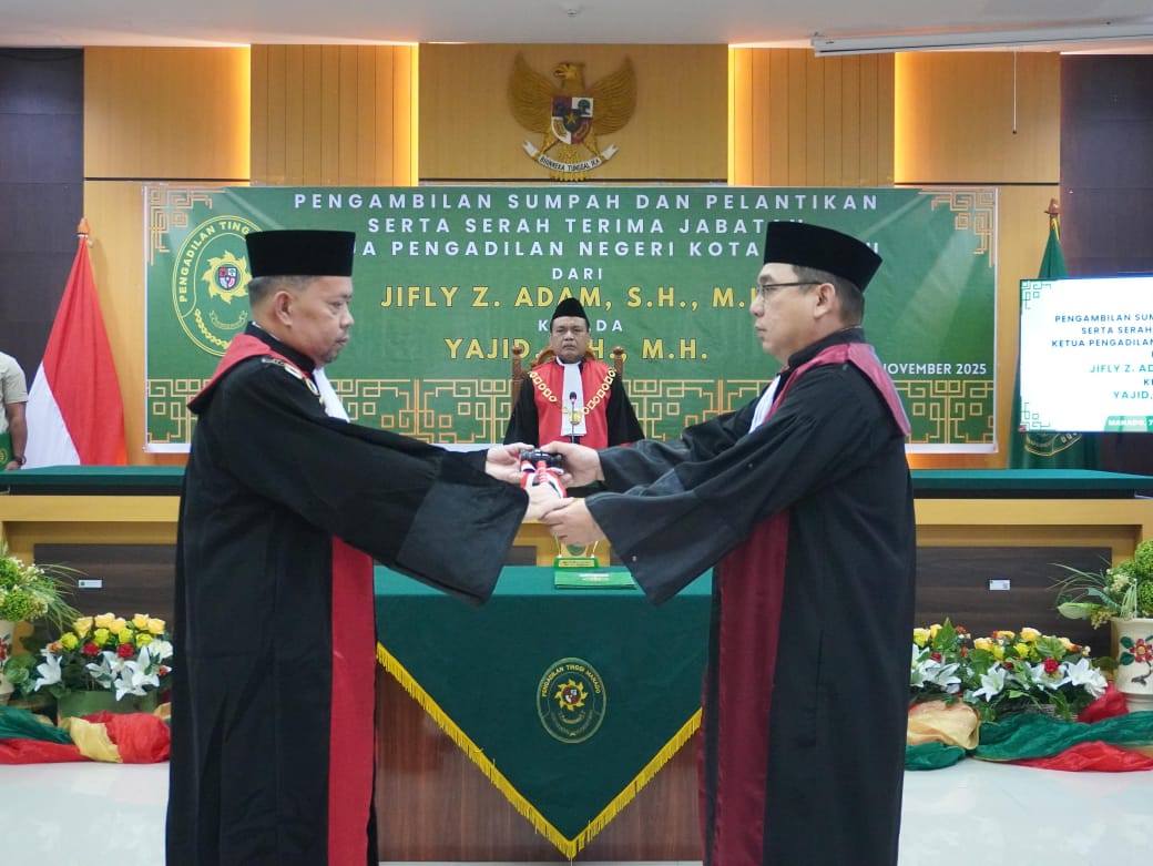 TNews, KOTAMOBAGU – engadilan Negeri Kotamobagu Kelas IB melaksanakan Pengambilan Sumpah dan Pelantikan serta Serah Terima Jabatan Ketua Pengadilan Negeri Kotamobagu dari Jifly Z. Adam, SH.,MH kepada Yajid, S.H., M.H, Jumat 7 November 2025.